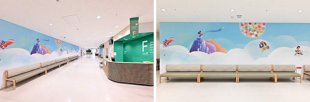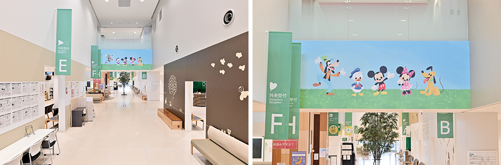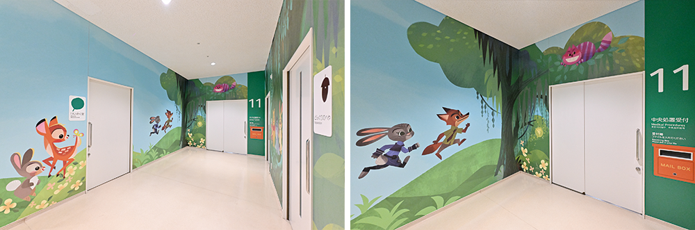 今回、福岡市立こども病院に提供された壁紙のテーマは「MAGICAL FOREST/魔法の森」。自然や森を意識した病院の優しいデザインに合わせて、自然豊かな森の世界をテーマに、ディズニーの豊かな物語の世界と個性豊かなたくさんのキャラクターたちの生き生きした様子が描かれ、病院を訪れるこどもたちとその家族を優しく包み込みます。1階のエリアに設置されたどの壁紙にも、治療や検査などに向かうこどもたちを勇気づけ、少しでも不安な気持ちを和らげたいという思いが込められています。