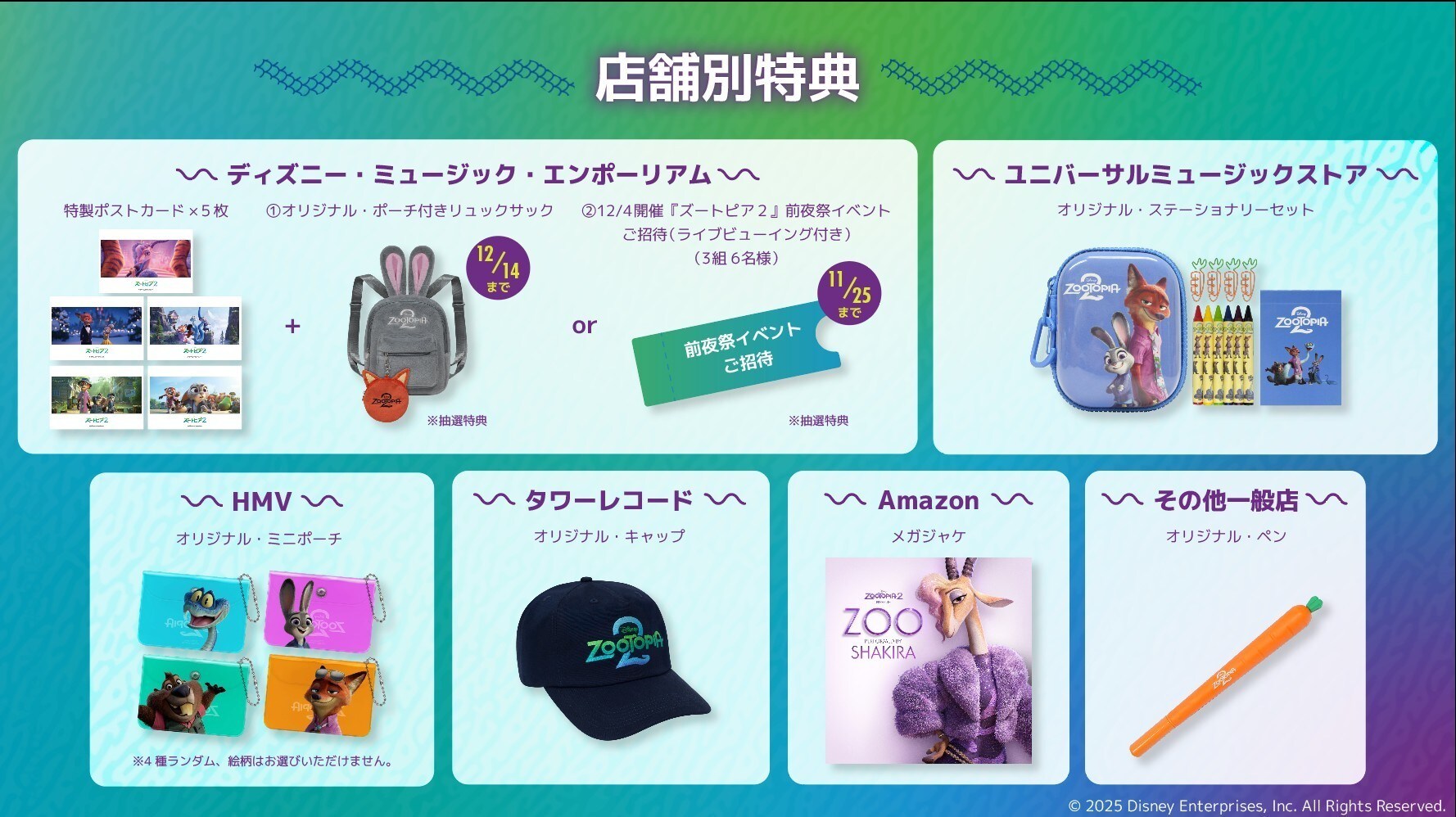 さらに、先着購入者特典も解禁されました。劇中のシーンが描かれたポストカード5枚セットや映画オリジナル・グッズなど、豪華ラインナップとなっています。さらに、ディズニー・ミュージック・エンポーリアムの限定抽選特典として、12月4日(木)に開催される『ズートピア2』 前夜祭のライブビューイングに3組6名様をご招待。ぜひチェックしてみてください!