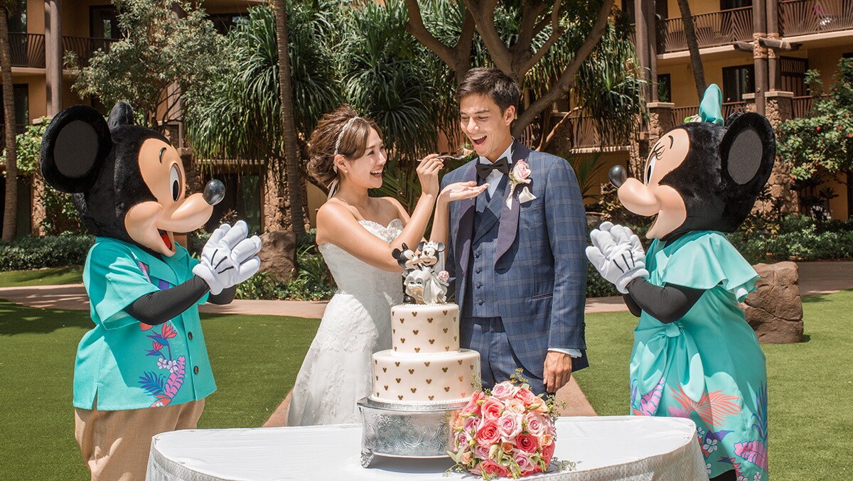 アウラニ・リゾートのでディズニー・フェアリーテール・ウエディングのパッケージは、最高峰のファンタジー・ウエディングからオーダーメイドでアウラニのウエディング・コーディネーターと挙式を創りあげるロカヒ・ウエディングまで多種多様。ケーキやブーケもバラエティー豊かな選択肢からお選びいただけます。お祝いに来てくれるディズニーキャラクターも、アウラニでのウエディングでしか出会えない特別な装いで大切な日に花を添えます。
