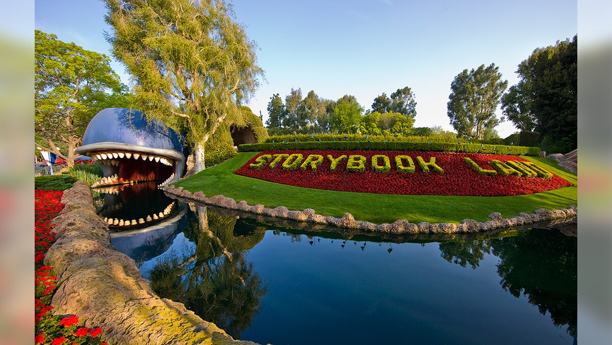 ファンタジーランドを歩いていると、ディズニーランド・リゾートの中でも特にユニークなアトラクションの看板が目に入ります。盛り上がった土手には、色鮮やかな植物で作られた巨大な文字で「Storybook Land」と書かれています。これは植物を使って独特のデザインを作り出すフランスの造園技法「パルテール」によるものです。 |