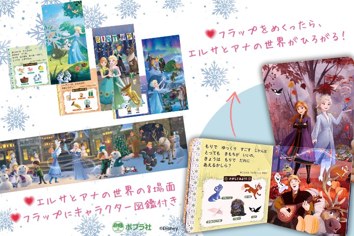 フラップをめくると、お城、お部屋、お庭、パーティー、森、トロルの谷など、エルサとアナの世界が広がります。