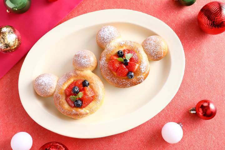 ミッキーマウスの形のパン生地に、たっぷりのカスタードクリームをのせて焼き上げ、いちごとブルーベリーをトッピング。