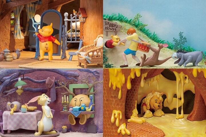 1977年に公開された長編アニメーション映画『くまのプーさん/完全保存版』、2000年公開の『ティガームービー/プーさんの贈りもの』から、選りすぐりの14シーンをジオラマ化。プー、ピグレット、ティガーをはじめとする100エーカーの森の仲間たちが繰り広げる冒険を、シリーズに付属するフィギュアとパーツで組み立てていきます。