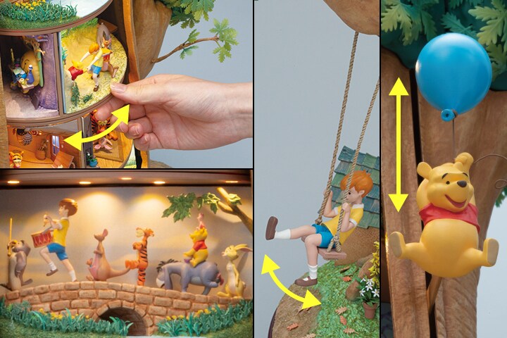 さらに、風船をつかんだプーと、ブランコで遊ぶクリストファー・ロビンが自動で動く仕掛けも。ライトアップや電動で動く仕掛けは専用リモコンで操作します。