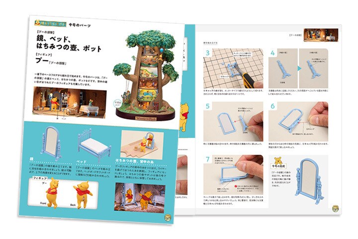 100エーカーの森にそびえる木をイメージしたツリー型のドールハウスは6フロアで構成。本シリーズでは、回転式の各フロアに『くまのプーさん』の名場面14シーンを再現したミニチュアジオラマを組み立てていきます。さらに、各号に付属するマガジンではパーツの組み立て方や登場キャラクター、ストーリーを解説。プーさんの世界をより深く楽しむことができます。