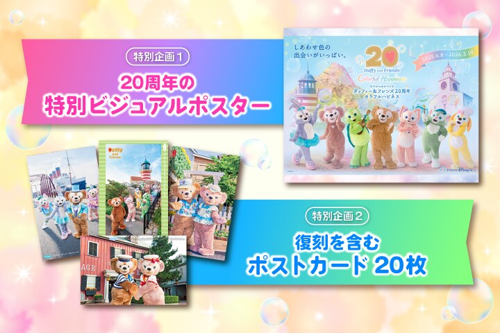 特別企画【20周年の特別ビジュアルのポスター】と【オリジナルポストカード】つき! 巻頭ポスターは「ダッフィー&フレンズ20周年:カラフルハピネス」の特別ビジュアル。ポストカードは撮り下ろし表紙の写真や、2015年から2024年までのダッフィー&フレンズに関するガイドブックやファンブックからの復刻など、全部で20枚ついています。