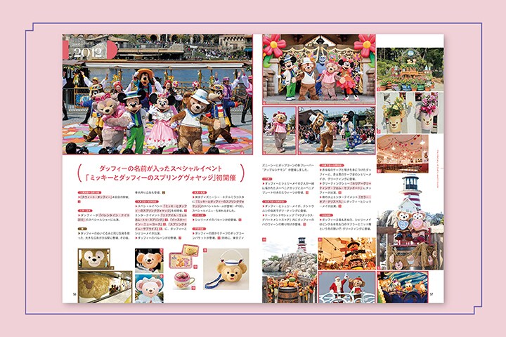 年表でダッフィー&フレンズの20年間の足跡をたどる!1年ごとに印象的な話題を集めた年表を、たっぷり35ページで大特集。イベントの写真をはじめ、象徴的なグッズやメニューも紹介しています。