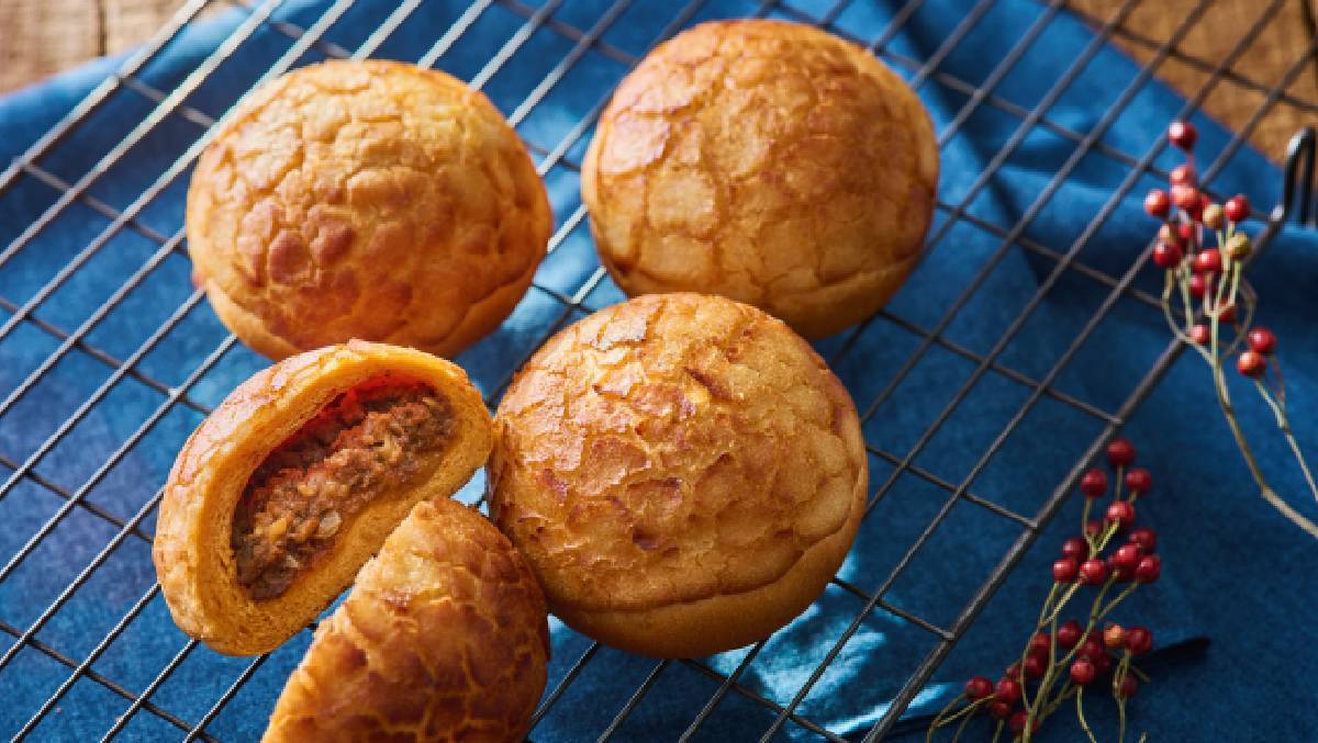 手作りのキーマカレーとチェダーチーズをたっぷりと包んで焼き上げます。