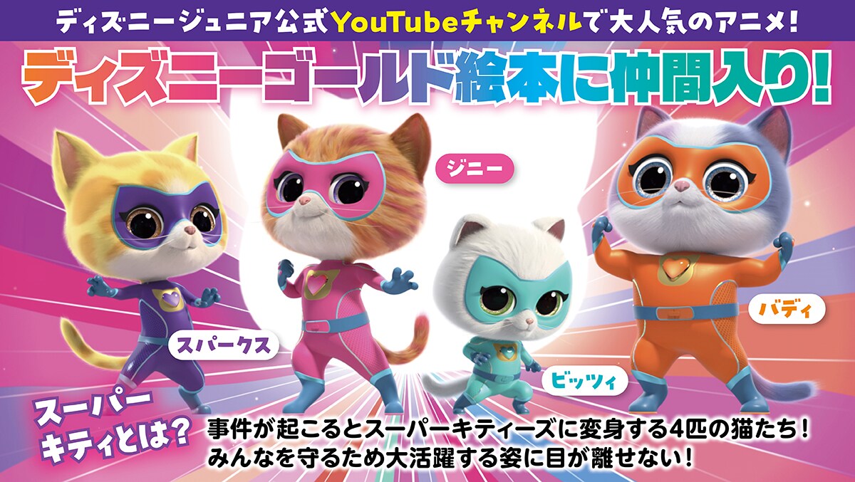 かわいくも勇敢な猫たちが街の平和を守る、子どもたちに大人気の『スーパーキティ』! ディズニージュニア公式YouTubeチャンネルでは、動画再生回数No.1を記録したアニメシリーズです。未就学児を中心にヒットしており、子ども向けグッズやアパレルなども展開され、その勢いはとどまるところを知りません。そんな『スーパーキティ』を日本で初めて書籍化した『スーパーキティ ディズニーゴールド絵本』が、ついに登場しました!