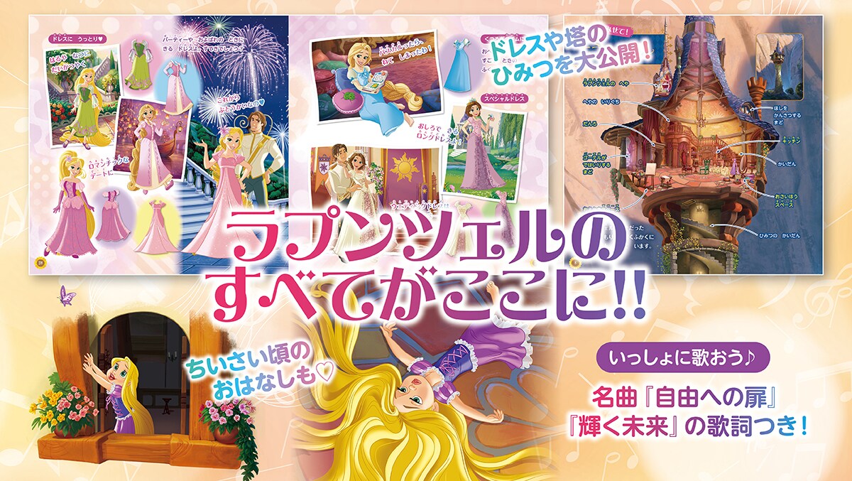 代表曲『自由への扉』『輝く未来』の歌詞も掲載。ラプンツェルになりきって歌いたくなりますね♪ さらに、映画の世界とはひとあじ違う、ラプンツェルがちいさい頃のおはなしやお城のお庭のページも。大人ファンも夢中になる、充実の内容です。
