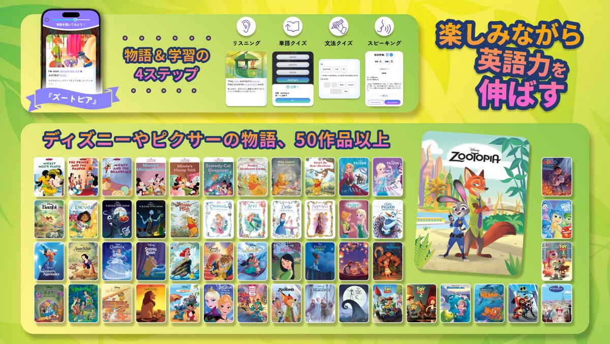 「ストーリー学習」は、ディズニーやピクサーの物語に沿って、場面ごとに次の4レッスンに取り組む「ファンタスピーク」オリジナルの学習メソッドです。