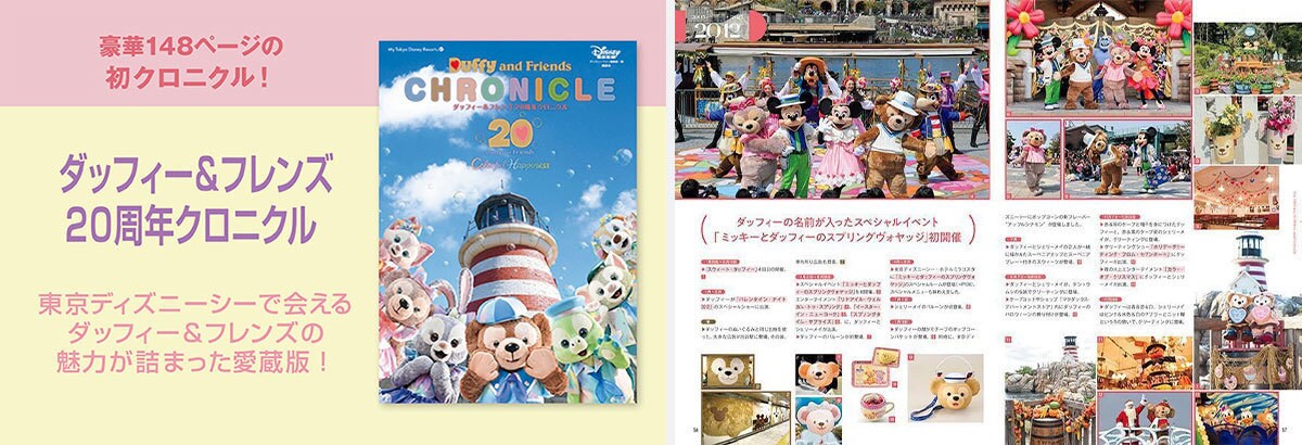 さらに、ダッフィー&フレンズの20年間の足跡をたどる年表をたっぷり35ページで大特集。イベントの写真をはじめ、今までに登場したぬいぐるみコスチューム、ぬいぐるみバッジ、フード関連スーベニアを紹介しています。
