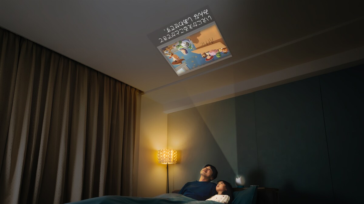 ママやパパが疲れていても、親子で一緒にベッドに入り、読み聞かせはやさしい音声と映像が投影される「DREAM SWITCH」にお任せ。