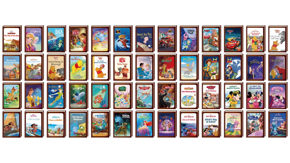 『くまのプーさん』をはじめ、ディズニープリンセス シリーズや『アナと雪の女王』、さらには『トイ・ストーリー』などのピクサー作品まで、幅広い全52作品を収録。日本語だけではなく、英語でも楽しめます。