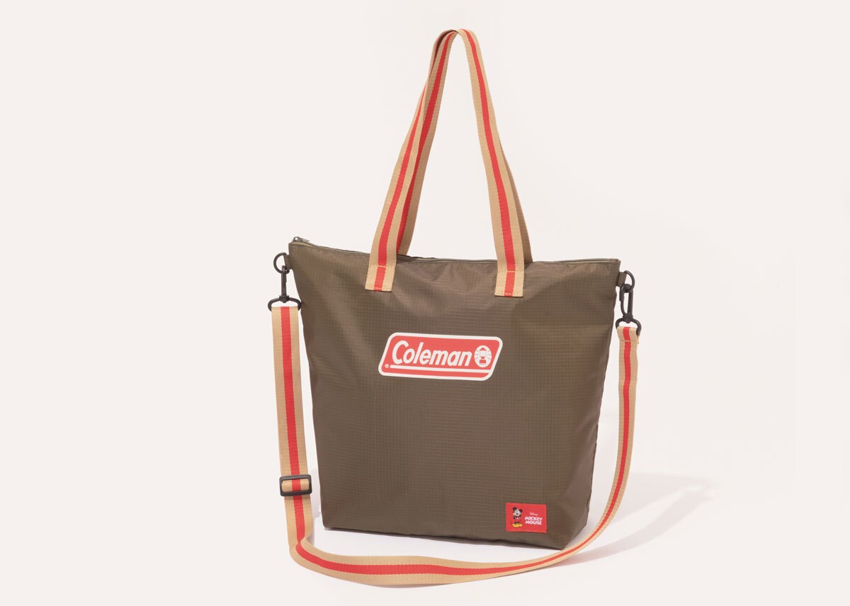 性別問わず、大人が持ちやすい落ち着いたカーキ色のリップストップ生地に、赤いコールマンのロゴと目隠しをしたキュートなミッキーのタグがアクセント。