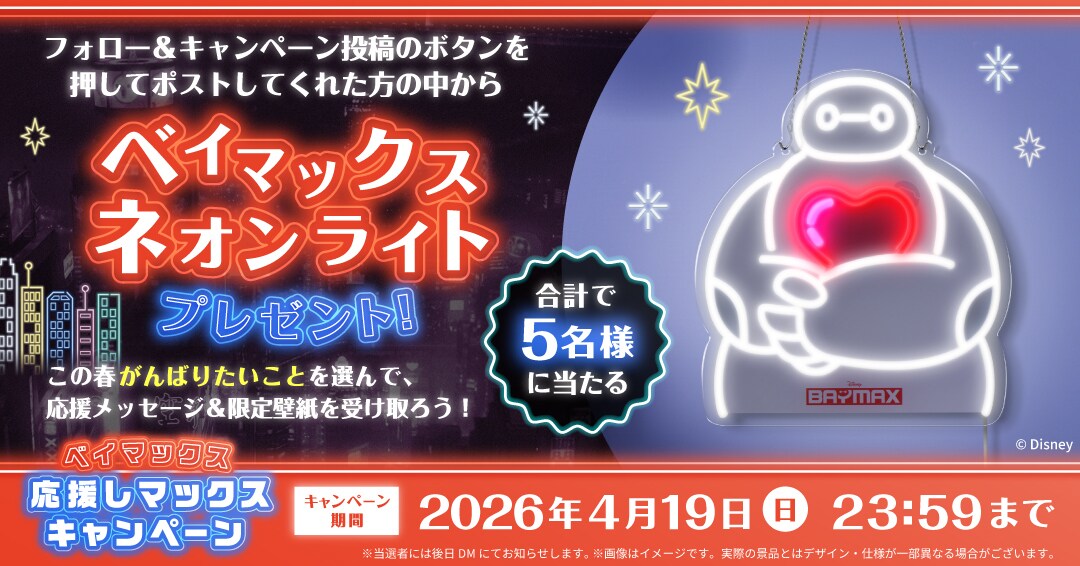 ディズニーショッピングのXアカウントをフォローし、 4つのボタンから1つを選んで投稿すると、ベイマックスのネオンライトが5名様にあたるキャンペーンを実施中♪
