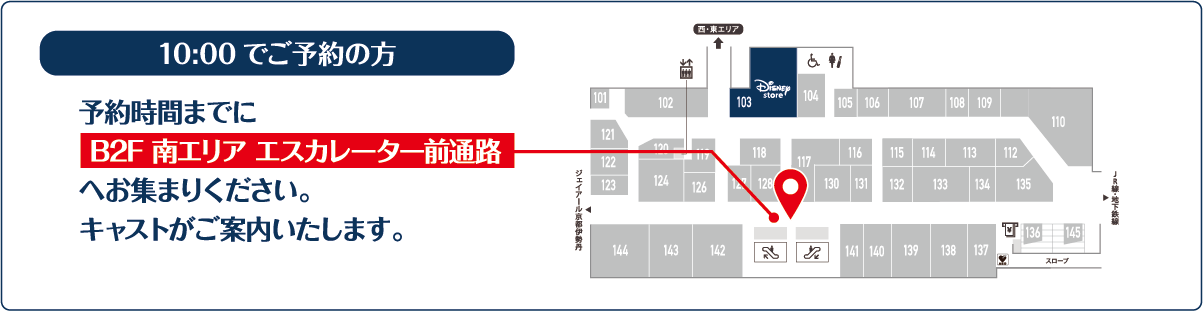 京都ポルタ B2F 南エリア エスカレーター前通路に 予約時間 までにお越しください。キャストがご案内します。
