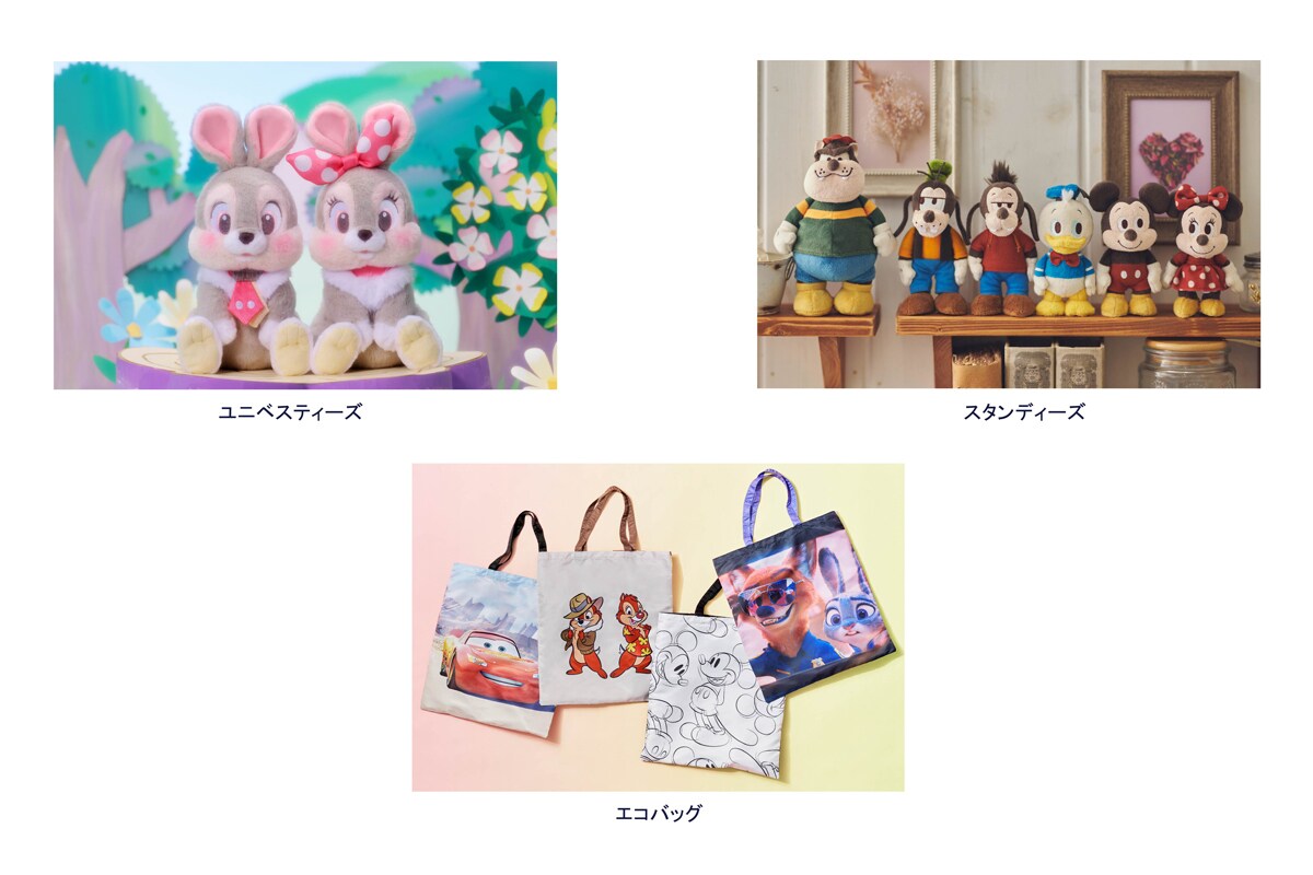 会場では、ぬいぐるみをはじめ、ステーショナリーやエコバッグなどの雑貨、アパレル、ギフトにぴったりなお菓子まで、約700種類のアイテムを取り揃えています。ぬいぐるみは、ディズニーストアオリジナルキャラクター「UniBestiez(ユニベスティーズ)」や、自立するレトロ可愛いぬいぐるみシリーズ「Disney stanDs(ディズニースタンディーズ)」などが揃います。
