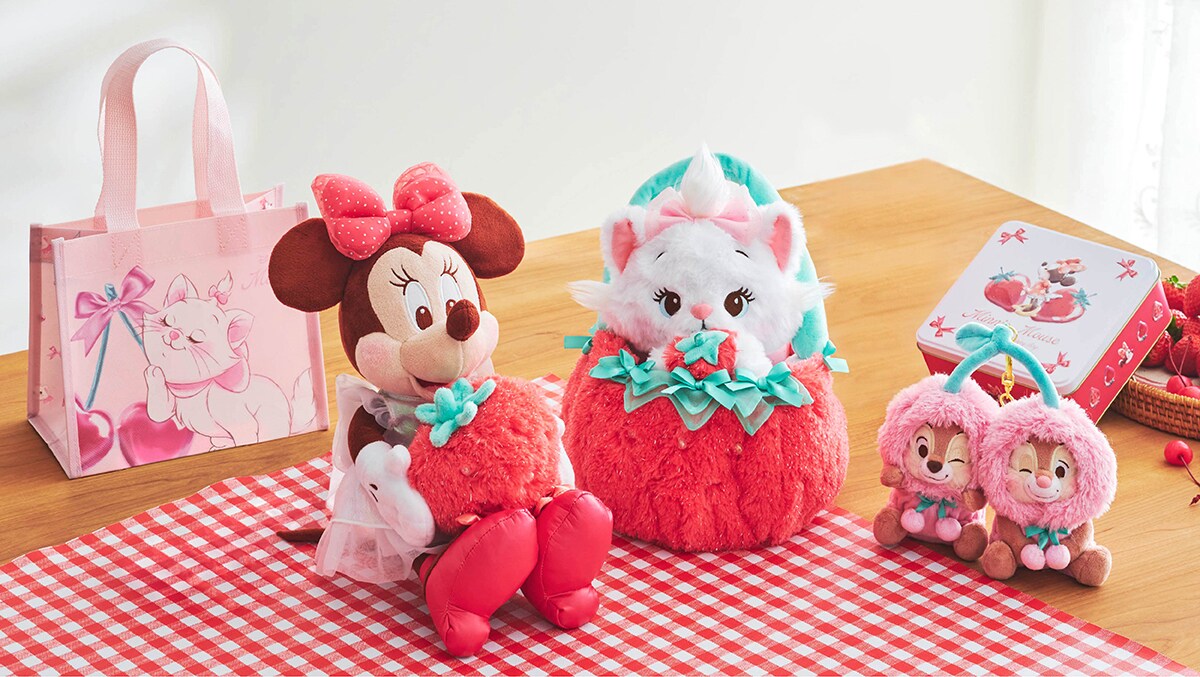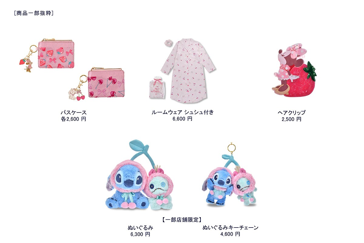 ぬいぐるみやぬいぐるみキーチェーンは、いちごを抱きしめた姿が愛らしいミニーやマリーのほか、チップ&デールがラインナップ。一部店舗限定でさくらんぼコスチューム姿のスティッチとスクランプも登場します。また、春らしいピンクを基調にフルーツ柄がキュートなショッピングバッグやパスケース、ルームウェアなど、日常で使えるアイテムが揃います。さらに、いちごチョコがけのワッフルクッキーは、缶ケース入りで見た目も可愛らしくプレゼントにもおすすめです。