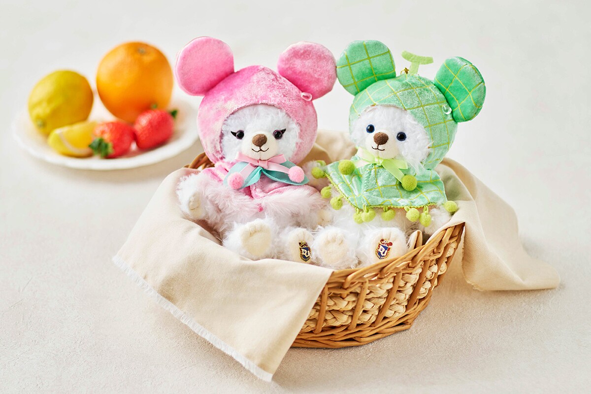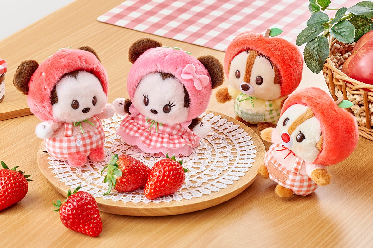 「うるぽちゃちゃん」から、フルーツの帽子をかぶったキャラクターのぬいぐるみが登場します。ミッキーマウスとミニーマウスはいちご、チップとデールはりんごをそれぞれ取り入れたデザイン。ころんとしたキュートなフォルムやギンガムチェック柄のコスチュームもポイントです。
