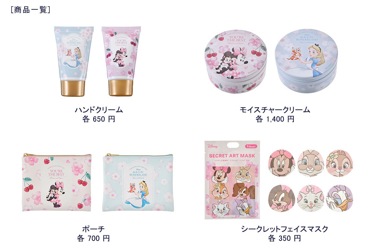桜やさくらんぼといった春らしいモチーフに、ミニーマウスやアリスをデザインしたビューティーアイテムが登場します。ハンドクリームやモイスチャークリーム、ポーチなど日常使いにぴったりなアイテムが揃い、春のギフトや新生活のスタートにもおすすめです。また、ミニーやデイジーダックたちをデザインしたシークレットフェイスマスクを展開します。