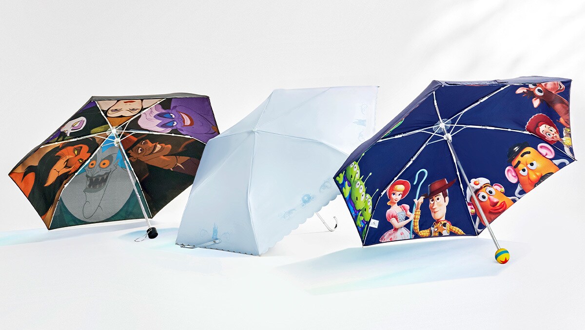 外側はシンプルながら、開くと内側にキャラクターアートが広がる折りたたみ傘が今年も登場。見上げるたびにキャラクターと一緒におでかけしているような気分を楽しめます。ミッキーマウス、グーフィー、アリエル、ディズニーヴィランズなどのアートや、持ち手のピクサー・ボールのモチーフが心くすぐる「トイ・ストーリー」デザインが登場します。また、キャラクターフェイスデザインのポーチ付き傘は、ドナルドダックとルシファーデザインを展開。そのほか、キャラクターのワンポイントが映える傘や、ハートのカラビナ付きで上品な色合いの傘など、コーディネートやシーンに合わせて選べる豊富なバリエーションをご用意しました。