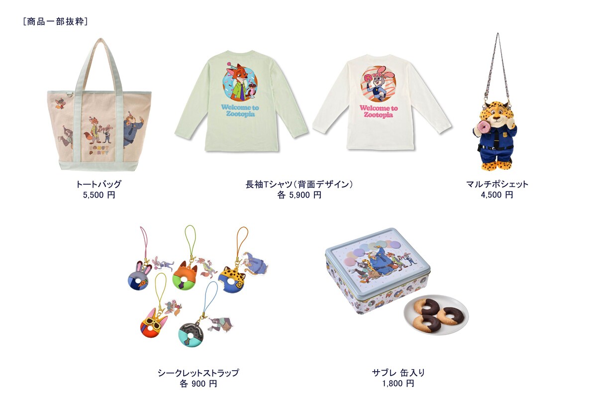 ぬいぐるみはジュディとニックに加え、ドーナツが大好物のクロウハウザーがラインナップ。両手にドーナツを持って嬉しそうな姿がキュートです。ぬいぐるみキーチェーンは、キャラクターをモチーフにしたドーナツ5種セットが登場。さらに、タンブラーやポーチなどの雑貨から、トートバッグやキャップなどのファッションアイテムまで幅広く展開します。長袖Tシャツは、ペアで並ぶとジュディとニックが乾杯しているように見える背面アートがポイント。ティッシュボックスカバーはドーナツの箱をイメージしたユニークなデザインで、日常を楽しく演出します。