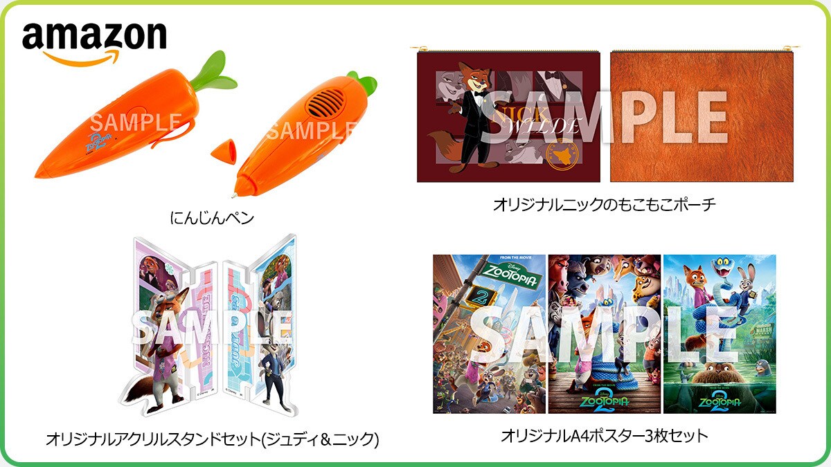 Amazon.co.jpでは4種の限定アイテム付きセット、さらにAmazon限定特典「アクリルコースター」付きのセットを展開しております! ニックとジュディとお揃いに出来る「にんじんペン」、まるでニックのようなもこもこ素材を使用した「オリジナルニックのもこもこポーチ」、ニックとジュディの名コンビを忘れられない名場面と共に楽しめる「オリジナルアクリルスタンドセット」。そして『ズートピア2』のわくわく感がつまった「A4ポスター3枚セット」。この機会に限定グッズと一緒に『ズートピア2』を一層お楽しみください!