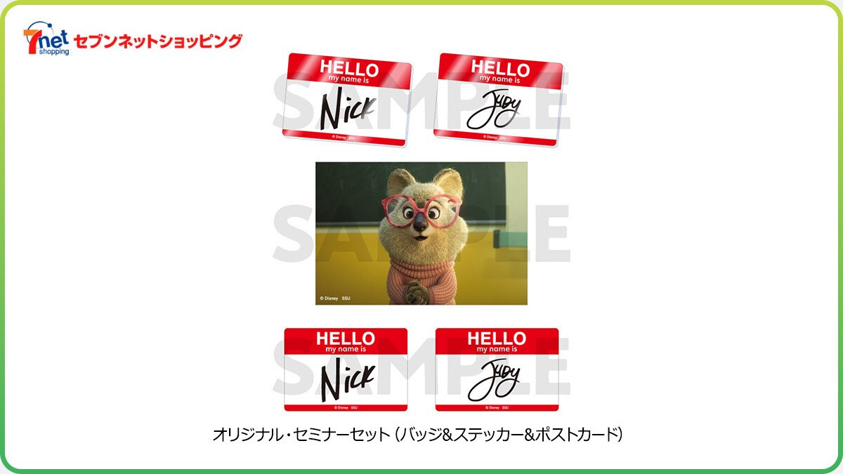 セブンネットショッピングでは、劇中のセミナーに参加した気分になれる豪華5点セット付き商品を展開! ニックとジュディの名札風「バッジ」と「ステッカー」に加え、セミナー講師DR.ファズビーがデザインされた「ポストカード」が付属。ここだけの限定アイテムで作品の世界観をお楽しみください!