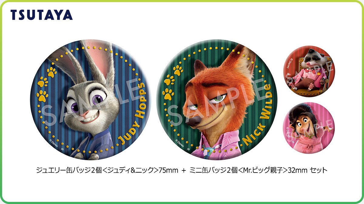 立体的で高級感のある金色のジュエリー箔を使用した、ジュディとニックの豪華なビッグサイズ缶バッジ2個&Mr.ビッグとフルー・フルー親子にピッタリなミニサイズ缶バッジ2個。名シーンが蘇る義理と絆の缶バッジ4個セット付き商品を展開!